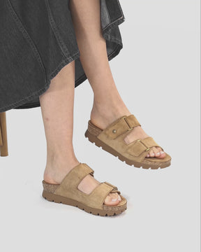 Flat woman's sandals. Natural suede. Velcro Closure. Leather lining. Anatomical insole. Lightweight, flexible, strong cork and EVA rubber sole. Heel height: 4.5 cm. 100% Made in Spain.