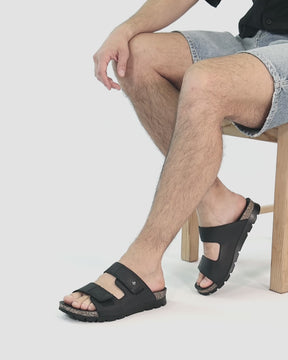 Men's sandals. Black nappa grass leather. Velcro Closure. Leather lining. Anatomical insole. Flexible and durable cork and Polyurethane sole. Heel height: 3 cm. 100% Made in Spain.