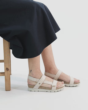 Flat woman's sandals. Natural Napa Leather. Velcro Closure. Leather lining. Anatomical insole. Lightweight, flexible, strong cork and EVA rubber sole. Heel height: 4.5 cm. 100% Made in Spain.
