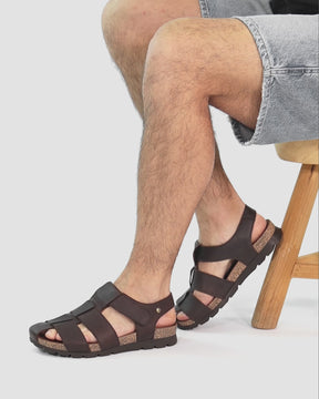 Men's sandals. WATERPROOF Brown nappa grass leather. Velcro Closure. Leather lining. Anatomical insole. Flexible and durable cork and Polyurethane sole. Heel height: 3 cm. 100% Made in Spain.