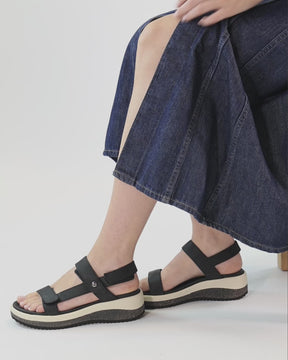 Sandalia de mujer con cuña. Piel Napa Grass Negro. Cierre de velcro. Forro interior de Piel. Plantilla anatómica. Suela de poliuretano, flexible y resistente. Altura tacón: 7.25 cm. 100% Hecho en España.