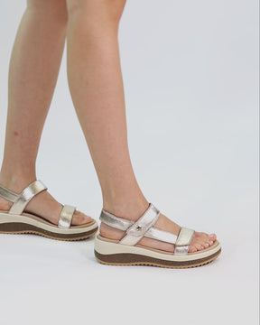 Sandalia de mujer con cuña. Piel Napa Oro. Cierre de velcro. Forro interior de Piel. Plantilla anatómica. Suela de poliuretano, flexible y resistente. Altura tacón: 7.25 cm. 100% Hecho en España.