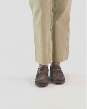 Náutico de mujer. Piel Velour Piedra. Cierre de cordones. Forro interior de Piel. Plantilla anatómica extraíble. Suela de caucho natural, flexible y resistente. Altura tacón: 4 cm. 100% Hecho en España.