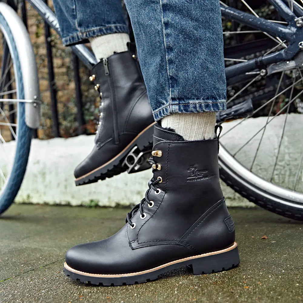 Bota de mujer plana. Piel Napa Negro WATERPROOF. Cierre de cordones y cremallera. Forro interior de Pelo natural. Plantilla anatómica extraíble. Suela de caucho natural, flexible y resistente. Altura caña: 16 cm. Altura tacón: 4 cm. 100% Hecho en España.