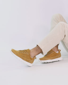 Sneakers de hombre. Piel Velour Ocre. Cierre de cordones. Forro interior de Piel. Plantilla anatómica extraíble. Suela de EVA, ligero, flexible y resistente. Altura tacón: 5 cm. 100% Hecho en España.