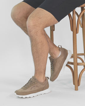 Sneakers de hombre. Piel Velour Taupe. Cierre de cordones. Forro interior de Piel. Plantilla anatómica extraíble. Suela de EVA, ligero, flexible y resistente. Altura tacón: 5 cm. 100% Hecho en España.