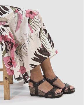 Sandalia de mujer con cuña. Piel Napa marrón. Cierre de velcro. Forro interior de Piel. Plantilla anatómica. Suela de corcho y EVA, ligero, flexible y resistente. Altura tacón: 6.5 cm. 100% Hecho en España.