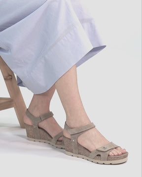 Sandalia de mujer con cuña. Piel Velour Taupe. Cierre de velcro. Forro interior de Piel. Plantilla anatómica. Suela de corcho y EVA, ligero, flexible y resistente. Altura tacón: 6.5 cm. 100% Hecho en España.