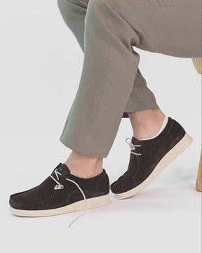 Zapato de hombre. Piel Velour marrón. Cierre de cordones. Forro interior de Piel. Plantilla anatómica extraíble. Suela de poliuretano, flexible y resistente. Altura caña: 7 cm. Altura tacón: 4.3 cm. 100% Hecho en España.