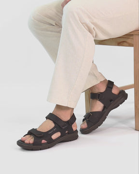 Sandalia de hombre. Piel Napa Grass marrón. Cierre de velcro. Forro interior de Lycra. Plantilla anatómica. Suela de poliuretano, flexible y resistente. Altura tacón: 5 cm. 100% Hecho en España.