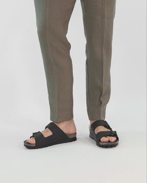 Sandalia de hombre. Piel Napa Grass Negro. Cierre de velcro. Forro interior de Piel. Plantilla anatómica. Suela de corcho y poliuretano, flexible y resistente. Altura tacón: 3 cm. 100% Hecho en España.