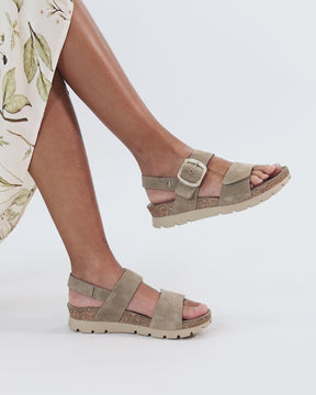 Sandalia de mujer plana. Piel Velour Taupe. Cierre de velcro. Forro interior de Piel. Plantilla anatómica. Suela de corcho y EVA, ligero, flexible y resistente. Altura tacón: 4.5 cm. 100% Hecho en España.