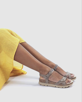 Sandalia de mujer plana. Piel Napa Natural. Cierre de velcro. Forro interior de Piel. Plantilla anatómica. Suela de corcho y EVA, ligero, flexible y resistente. Altura tacón: 4.5 cm. 100% Hecho en España.