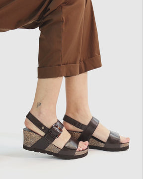 Sandalia de mujer con cuña. Piel Napa marrón. Cierre de velcro. Forro interior de Piel. Plantilla anatómica. Suela de corcho y EVA, ligero, flexible y resistente. Altura tacón: 6.5 cm. 100% Hecho en España.