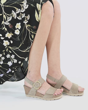 Sandalia de mujer con cuña. Piel Velour Taupe. Cierre de velcro. Forro interior de Piel. Plantilla anatómica. Suela de corcho y EVA, ligero, flexible y resistente. Altura tacón: 6.5 cm. 100% Hecho en España.