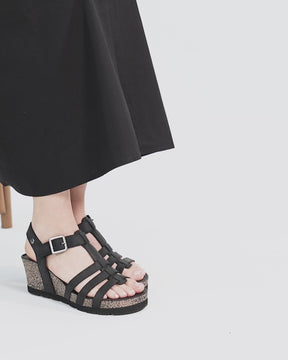 Sandalia de mujer con cuña. Piel Napa Grass Negro. Cierre de velcro. Forro interior de Piel. Plantilla anatómica. Suela de corcho y EVA, ligero, flexible y resistente. Altura tacón: 6.5 cm. 100% Hecho en España.